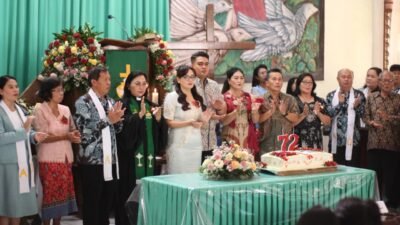 Hadir juga Ketua Panitia HUT ke-72 Pnt. Wisye Paat-Lomboan, S.H., jajaran panitia, Anggota DPRD Kota Tomohon Drs. Haryanto Lasut, M.A.P., Abraham Wakas, S.Si., M.Ak., dan Anita Mamesah; para hamba Tuhan yang pernah melayani; serta seluruh anggota jemaat dari kolom 1–13. (*)