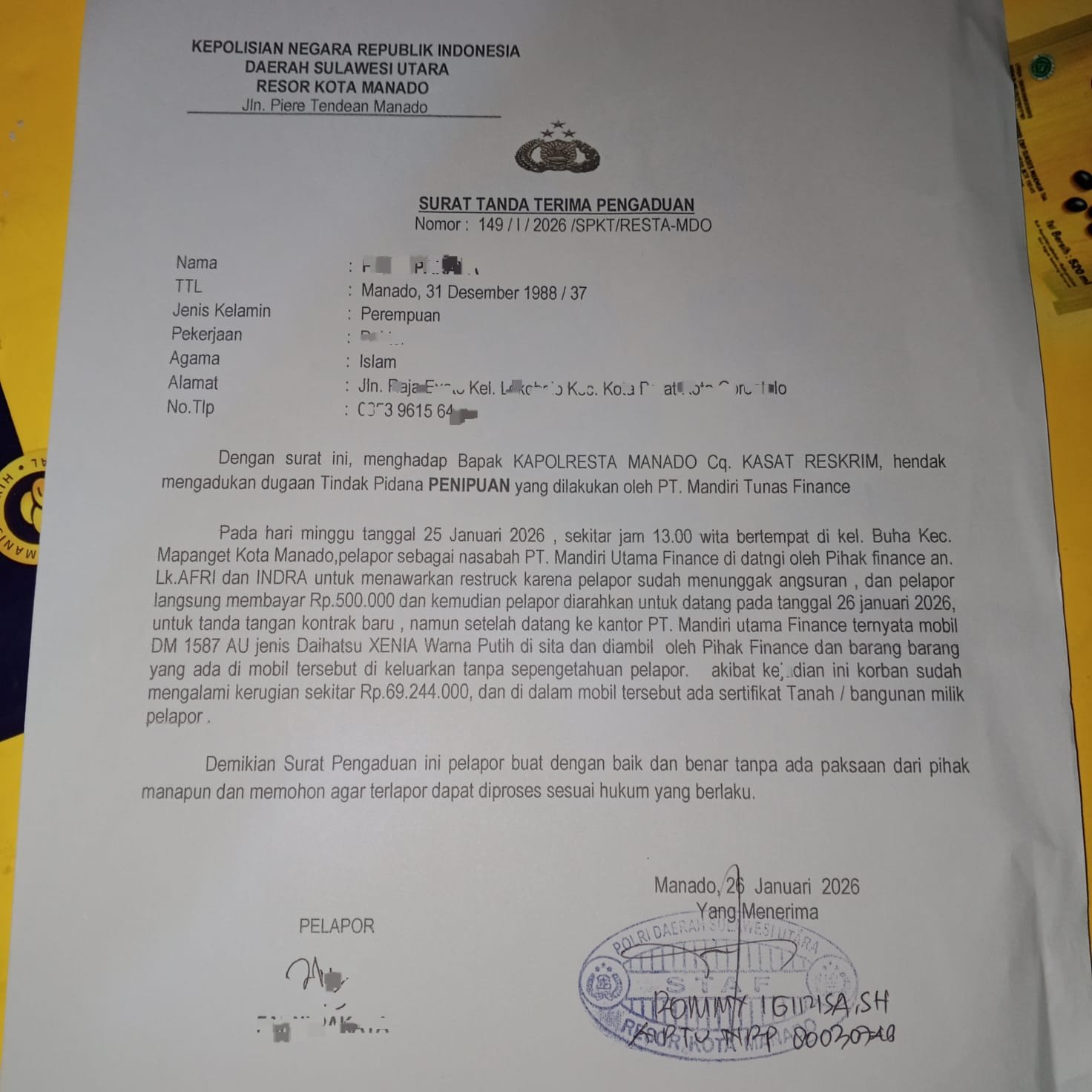 ”Saya merasa dirugikan dengan perbuatan MUF Cabang Manado, dan telah melaporkan hal ini ke SPKT Polresta Manado.” terang Korban, yang merasa dirugikan puluhan juta rupiah apalagi didalam mobil ada surat surat berharga dan uang tunai.