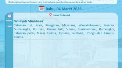 Manado, swararakyat.id – Demi meningkatkan kualitas pelayanan dan keandalan pasokan listrik kepada masyarakat, PLN UP3 Manado melalui ULP Tondano dan ULP Airmadidi akan melaksanakan pekerjaan pemeliharaan jaringan pada Rabu, 04 Maret 2026 mendatang. Pekerjaan ini akan berdampak pada penghentian sementara aliran listrik di sejumlah wilayah.