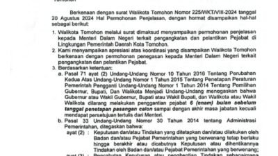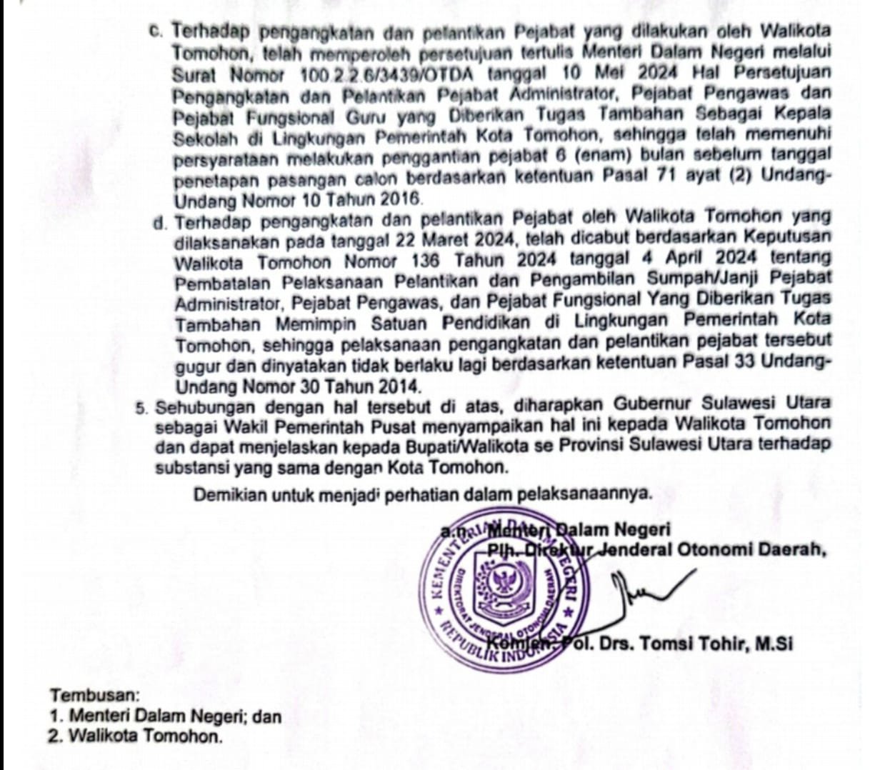 Keyakinan itu dikemukakan pengamat Boaz Wilar dengan merujuk butir C surat Kemendagri Nomor 100.2.2.6/6846/OTDA Tentang Penjelasan Terhadap Pelaksanaan Pengangkatan dan Pelantikan Pejabat di Lingkungan Pemerintah Daerah Kota Tomohon, tertanggal 5 September 2024.