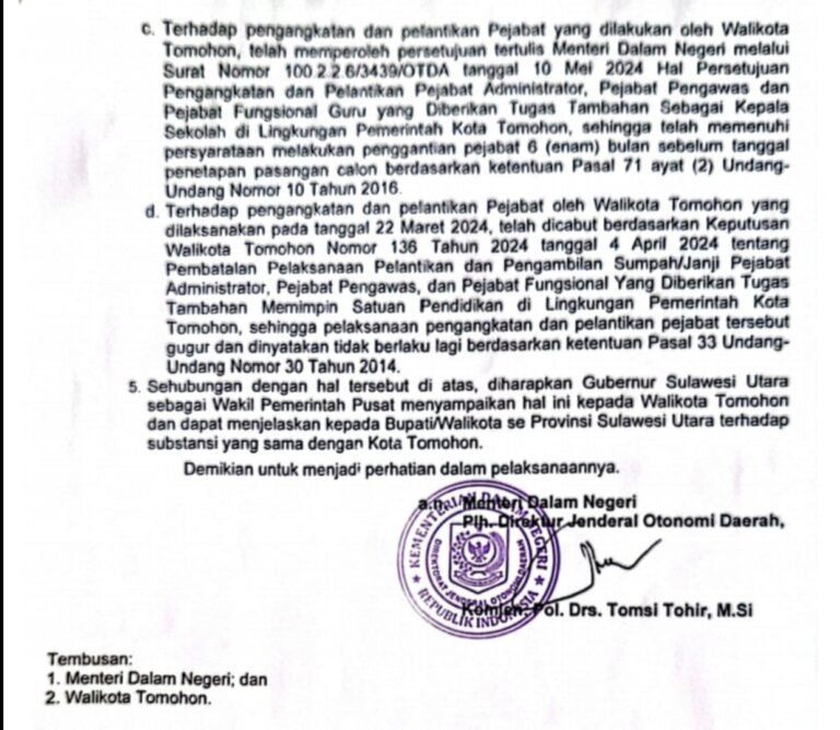 “Huruf C surat yang ditandatangani Plh. Direktur Jenderal Otonomi Daerah, Komjen Drs. Tomsi Tohir, MSi atas nama Mendagri, itu sudah sangat jelas menyatakan jika pelantikan yang dilakukan Walikota Tomohon telah mendapat persetujuan tertulis menteri, yang juga merujuk ke Pasal 33 UU Nomor 30/2014 (UU Administrasi Pemerintahan),” paparnya.